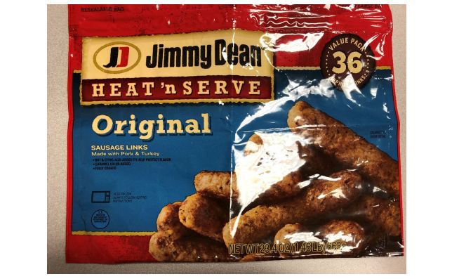 23.4-oz. pouches of “Jimmy Dean HEAT ’n SERVE Original SAUSAGE LINKS Made with Pork & Turkey” with a Use By date of Jan. 31, 19. The product bears case code A6382168, with a time stamp range of 11:58 through 01:49.