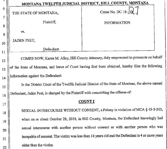 Jaden Peet is being held in the Hill County Detention Center on two counts of sexual intercourse without consent involving a 13-year old girl.