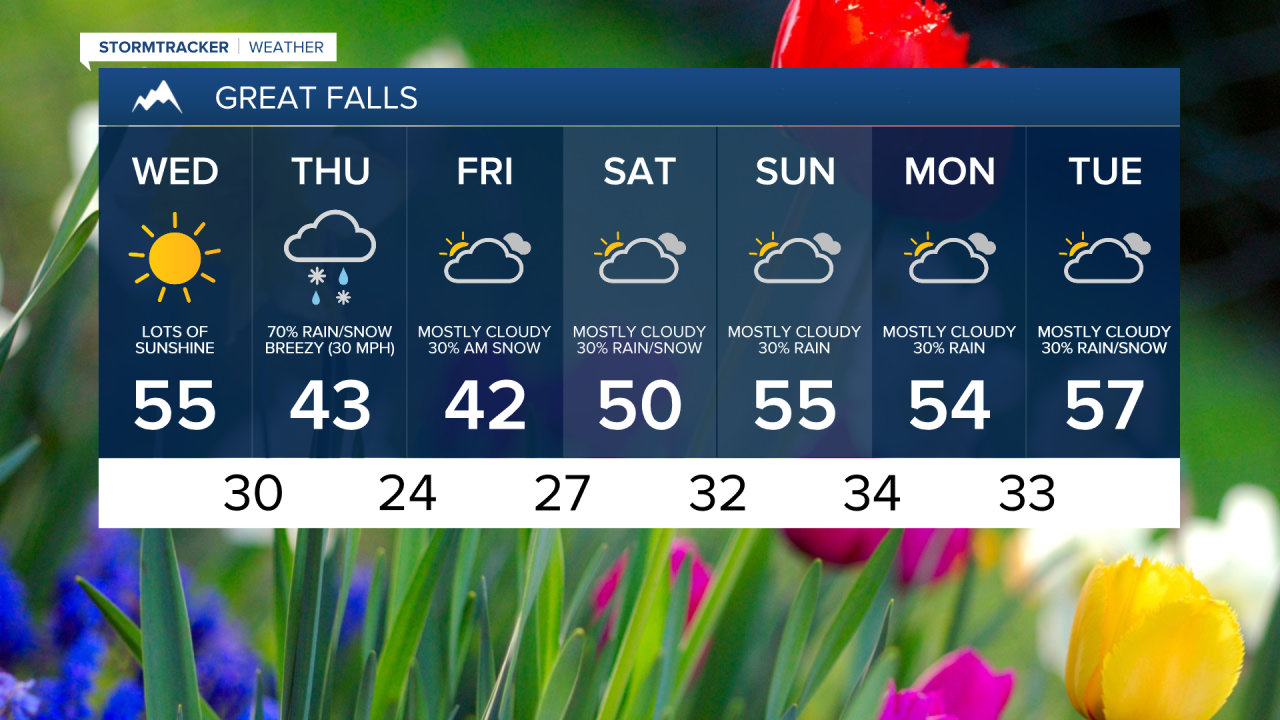 Thursday's weather will take a sharp turn with a strong cold front that will not only drop our temperatures below average for Thursday and Friday (highs in the low 40s), but bring us the opportunity for rain, snow, and breezy conditions. By Thursday night there's the potential for any precipitation to turn to all snow. Accumulations look a bit tricky with this forecast, but a trace to 3" of snowfall are possible by Friday morning. This is good news for areas that are experiencing drought, but unfortunately it looks like the areas with the worst drought in Eastern Montana may not get much in the way of measurable precipitation at all. We'll of course monitor this as things unfold.