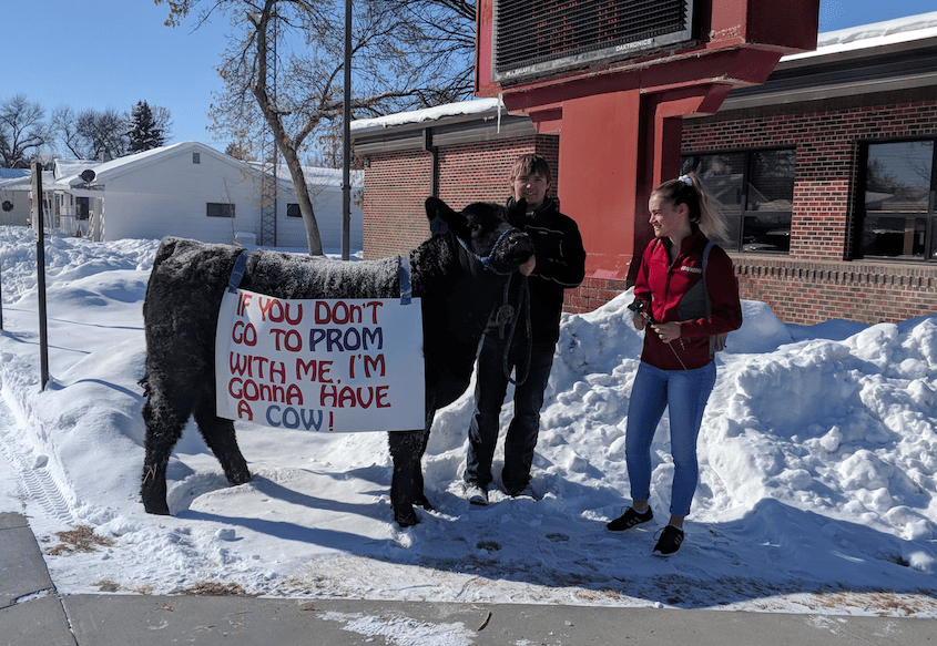 Burney used his steer Beef Cakes to ask fellow student Leah Fowles to prom Tuesday complete with a sign that read, “If you don’t go to prom with me, I’m gonna have a cow!”