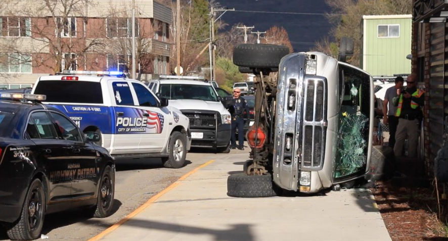 MISSOULA – After finishing a relaxing evening out for pizza with his family, a Missoula man was nearly crushed by a truck crashing at the end of a high-speed chase Friday.