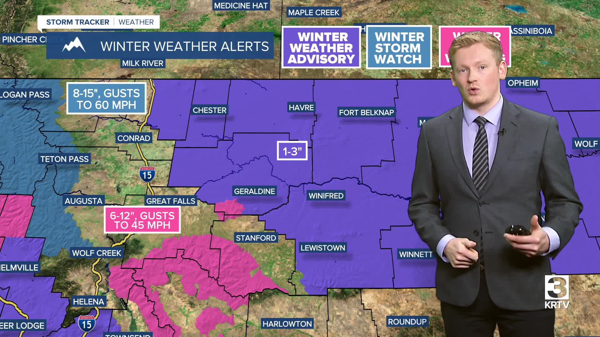 WEATHER FORECAST: Mostly cloudy with a few, widely scattered rain and snow showers. Widespread snow moves in tonight, and there could be some rain mixed in for lower elevations initially. Daytime highs in the upper 20s and lower 30s on the Hi-Line and low to mid 30s across central Montana. A heavy burst of snow is possible during the onset of tonight's precipitation, moving through just after sunset.