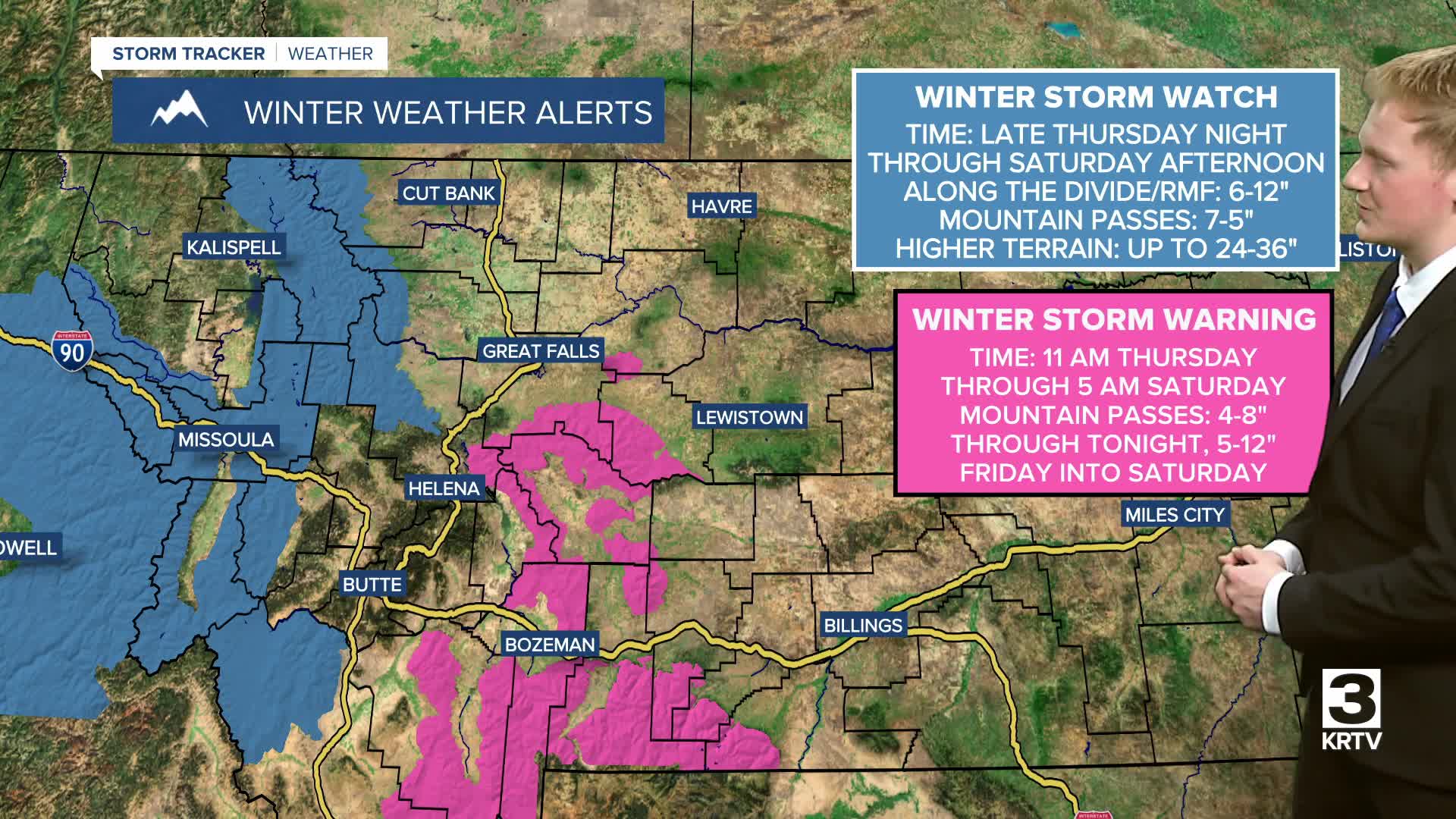 WEATHER FORECAST: Cloudy and breezy. Scattered snow showers for the lower elevations and steadier snow in the mountains. Daytime highs will be in the mid to upper 30s. A Winter Storm Warning goes into effect at 11 a.m. this morning through 5 a.m. Saturday for the mountains of central Montana. 4 to 8 inches of snow is possible today over Kings Hill and in the higher terrain and another 5 to 12 inches of snow Friday evening through Saturday afternoon.