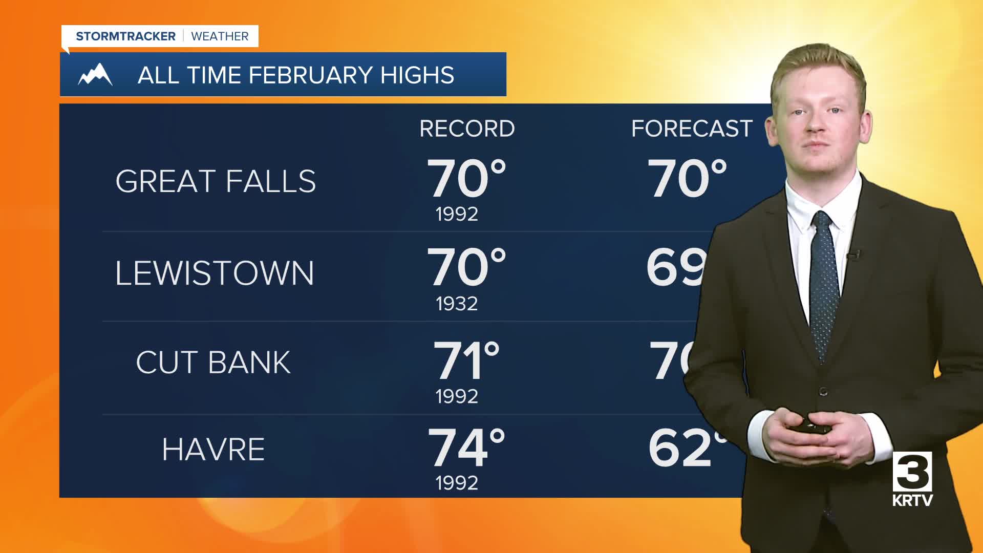 WEATHER FORECAST: Abundant sunshine and record warmth. High temperatures in the 60s and lower 70s. Wind speeds between 10 and 20 mph and a few gusts over 40 mph near the Rocky Mountain Front.
