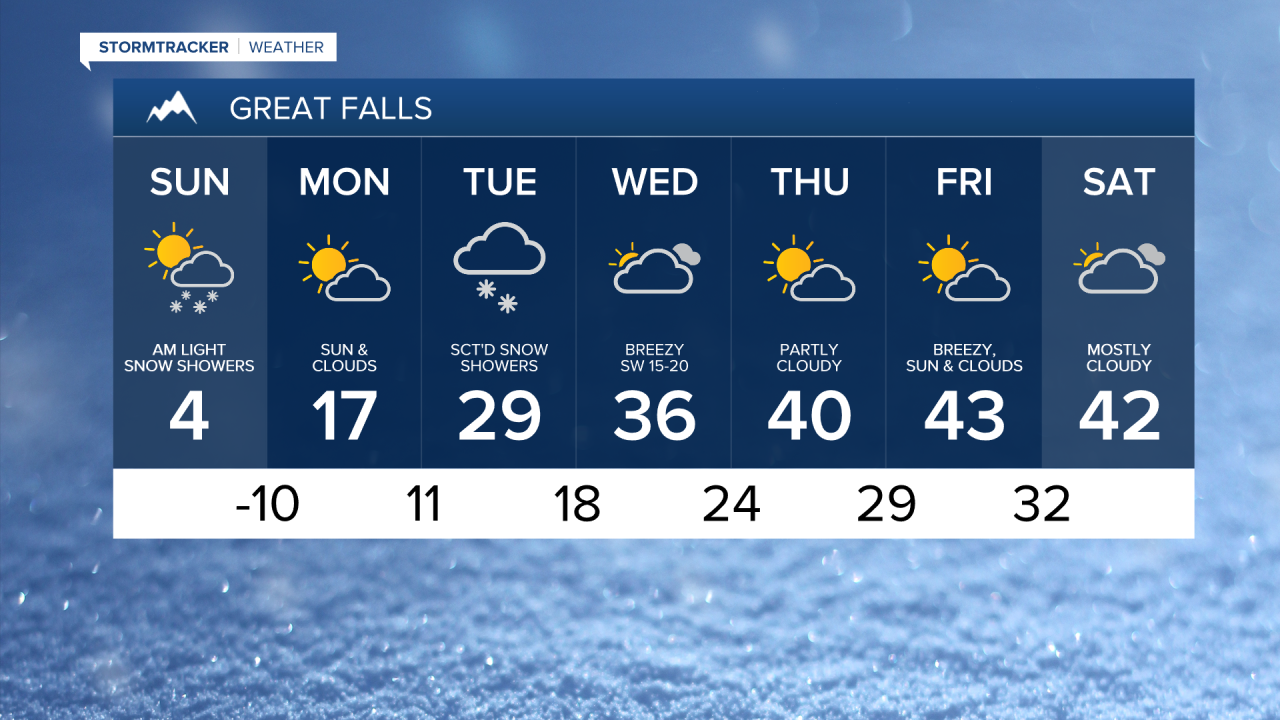 TUESDAY: Scattered, light snow showers. Snow accumulating a dusting to 2 inches. Otherwise, partly to mostly cloudy skies. Highs in the mid to upper 10s for the Hi-Line, mid to upper 20s for the rest of central Montana. Mostly cloudy overnight as temperatures fall into 0s for the Hi-Line, low to mid 10s throughout the rest of central Montana.