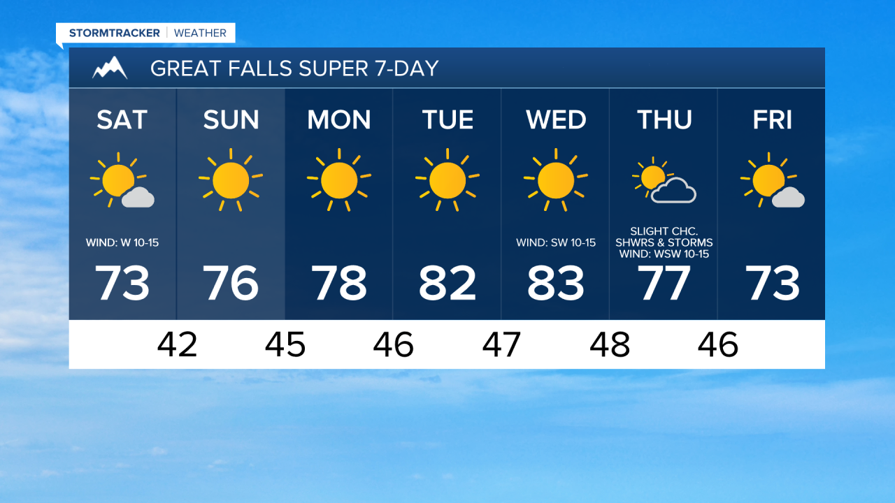 We are then going to have partly cloudy to mostly sunny skies with a slight chance of showers and thunderstorms on Thursday and Friday as a couple disturbances pass through our area. The temperatures are also going to cool back down a little bit over these two days as highs are going to be in the mid to upper 70s on Thursday and the low to mid 70s on Friday. There is also going to be a little bit of a breeze around on Thursday as sustained wind speeds are going to be between 10 and 15 mph, and this wind is going to be coming out of the west.