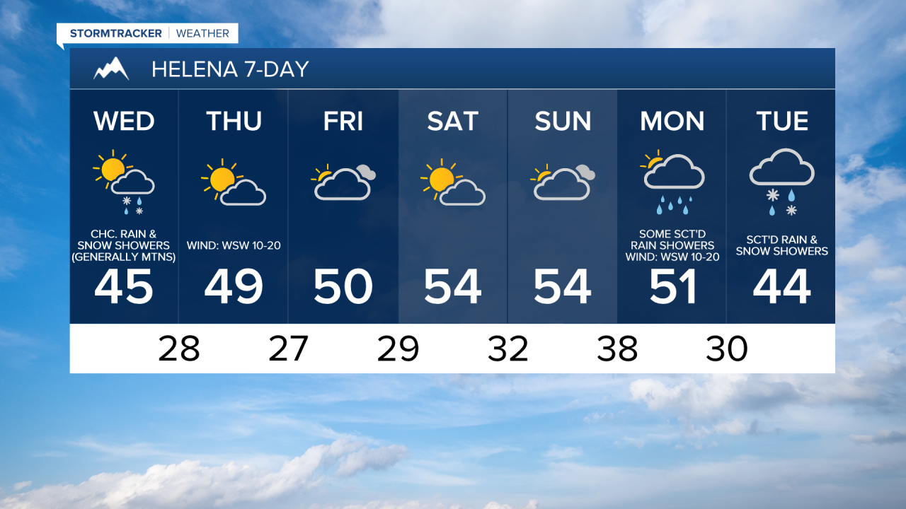 On Monday, we are going to have a chance to see some rain and mountain rain/snow showers, especially around the Helena area, as another disturbance begins to approach our area. There are then going to be scattered rain and snow showers around on Tuesday as this disturbance passes through our area. We are also going to have partly to mostly cloudy skies on these two days. The temperatures are also going to cool down some over these two days as highs are going to be in the low to mid 50s on Monday and the 40s on Tuesday. A strong westerly/southwesterly breeze is also expected on Monday as sustained wind speeds are going to be between 15 and 30 mph, and wind gusts up to 50 mph are going to be possible at times.