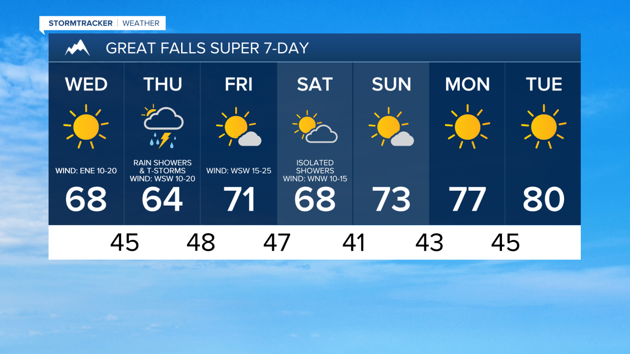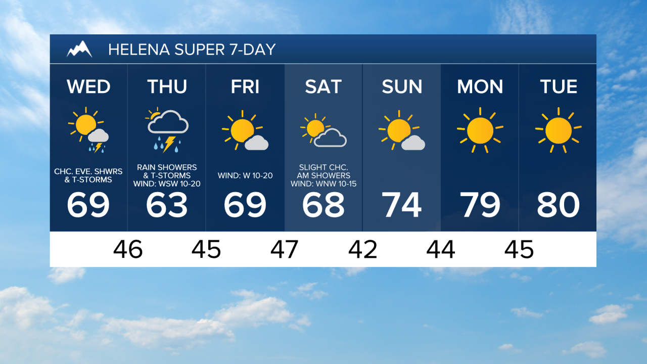 For tomorrow, we are going to have lots of sunshine during the morning and afternoon. We are then going to have increasing clouds tomorrow evening with a chance of showers and thunderstorms around the Helena area. It is also going to be warmer tomorrow than it was today as highs are going to be in the 60s in most locations. There is also going to be a breeze around in spots tomorrow as sustained wind speeds are going to be between 10 and 20 mph, and wind gusts over 30 mph are going to be possible at times.
