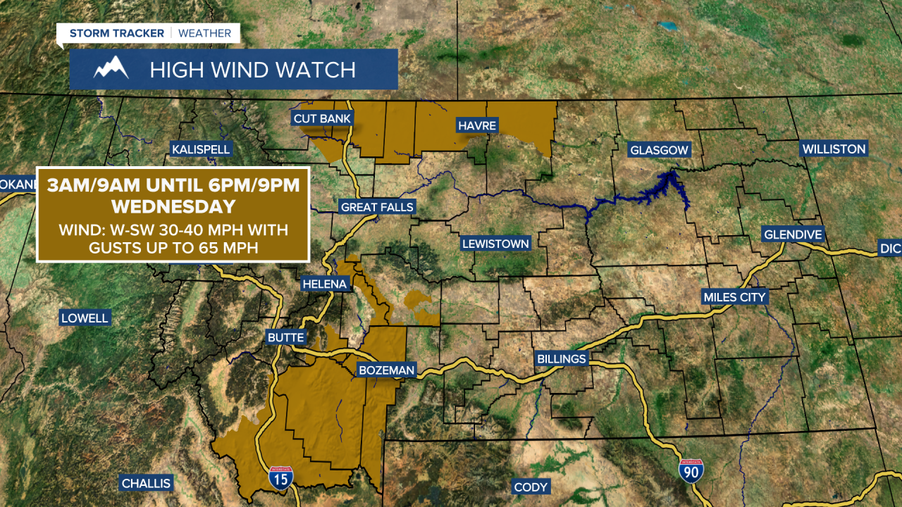 Widespread gusty to strong winds will return to our area on Wednesday. Sustained wind speeds are going to be between 15 and 35 mph, and wind gusts will be between 40 and 65 mph. A HIGH WIND WATCH is in effect for portions of the Hi-Line from Cut Bank to the Blaine/Phillips County line and for portions of southwestern Montana for most of the day as gusts up to 65 mph are possible in these locations.