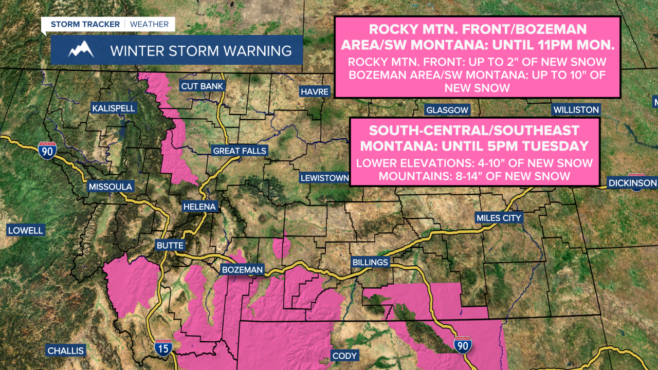 A WINTER STORM WARNING is in effect for the Rocky Mountain Front, portions of southwestern Montana, and the Bozeman area until 11pm Monday.