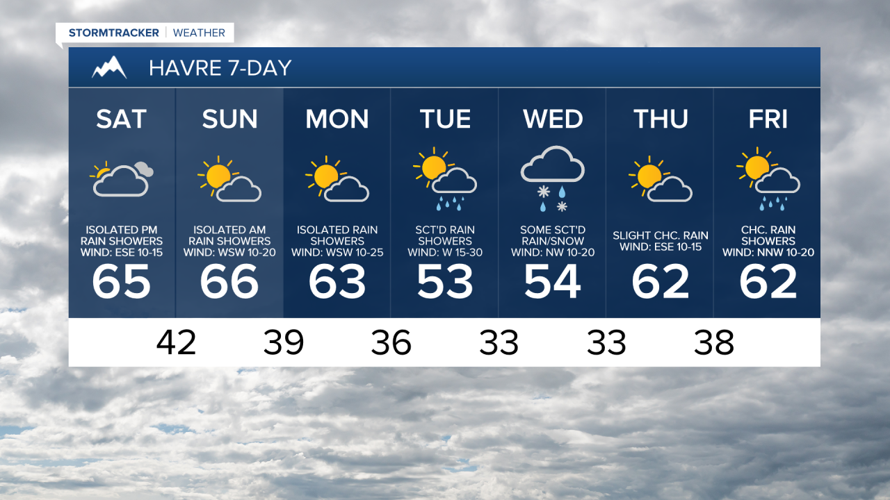 We are then going to have partly cloudy skies on Sunday with a few isolated rain showers around as this storm system leaves our area. We are also going to have gusty winds around on Sunday along the Rocky Mountain Front as sustained wind speeds are going to be between 15 and 35 mph, and it is going to be breezy on Sunday in some areas east of the Rocky Mountain Front as sustained wind speeds are going to be between 10 and 25 mph. It is also going to be warmer on Sunday than it is going to be tomorrow as highs are going to be in the mid to upper 50s and low to mid 60s.