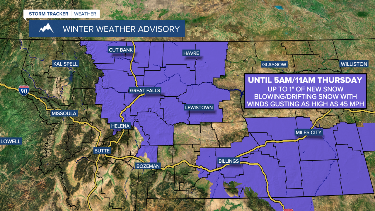 A WINTER WEATHER ADVISORY is in effect for most of central and north-central Montana until 5am/11am Thursday. Up to 1 inch of new snow accumulation is possible. Blowing snow is also expected as winds are going to be gusting as high as 45 mph.