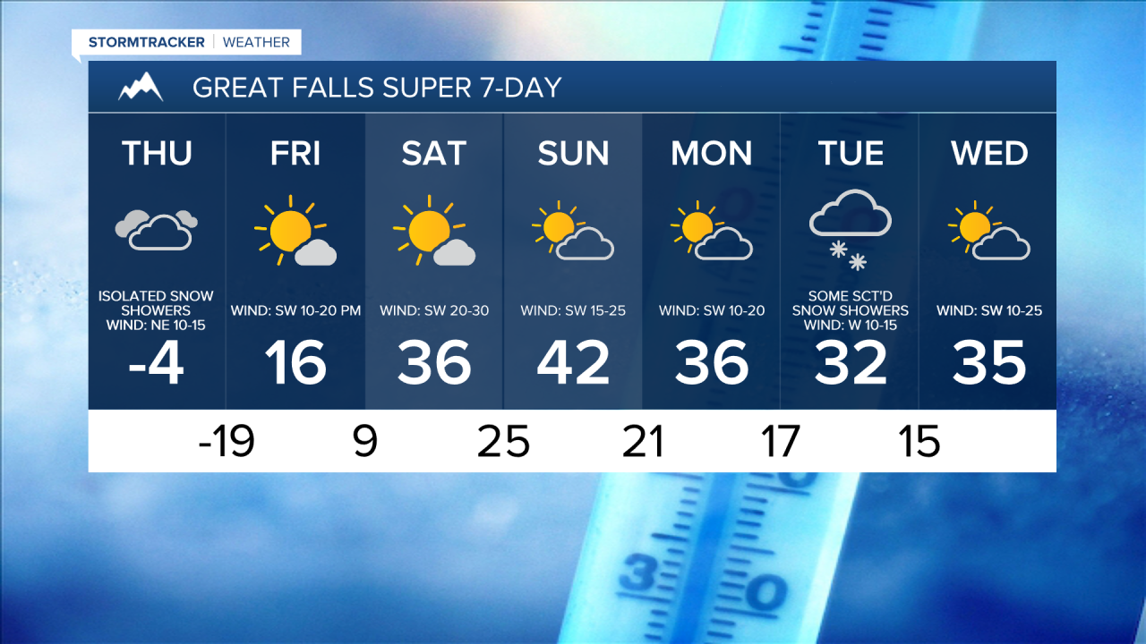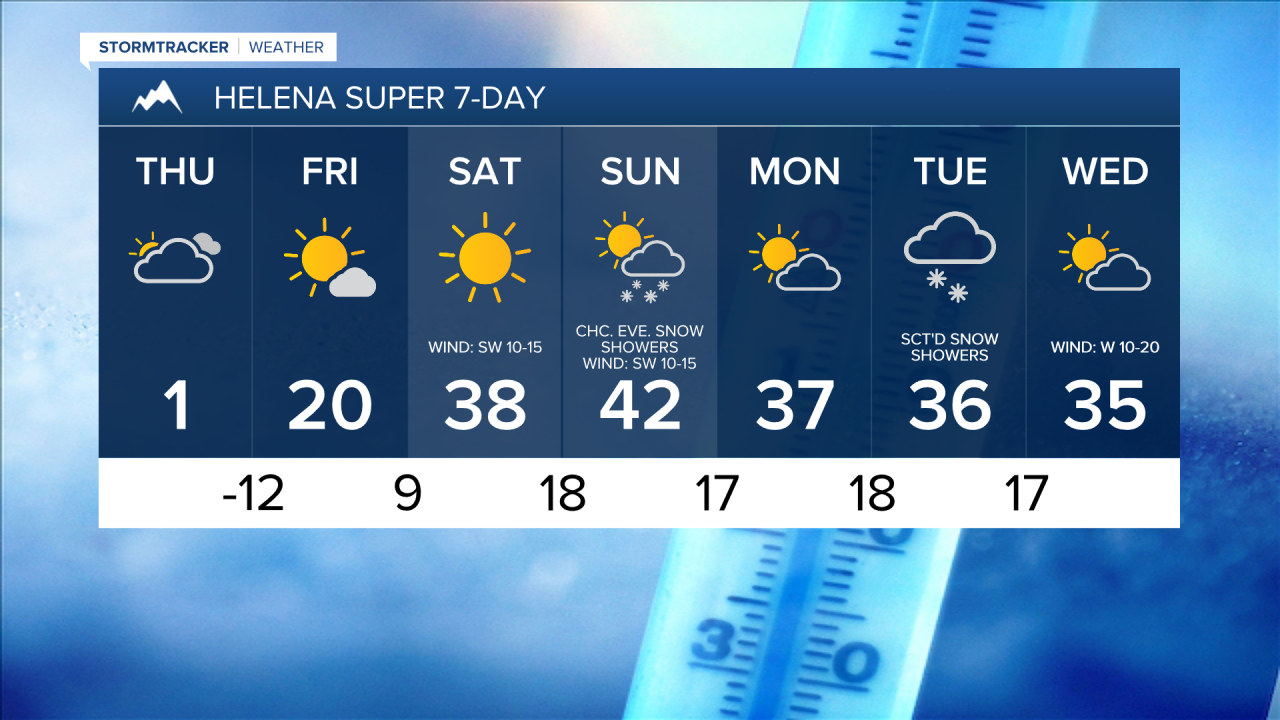 The temperatures are then going to continue to warm up this weekend as highs are going to be in the 20s and 30s on Saturday and the 30s and low to mid 40s on Sunday. These warmer temperatures are going to be accompanied by a gusty to strong southwesterly breeze though as sustained wind speeds are going to be between 15 and 35 mph, and wind gusts over 50 mph are going to be possible at times, especially on Saturday. We are also going to have mostly sunny skies and dry conditions on Saturday. We are then going to have increasing clouds on Sunday with a chance of PM snow showers along the Continental Divide and around the Helena area as a cold front approaches our area.