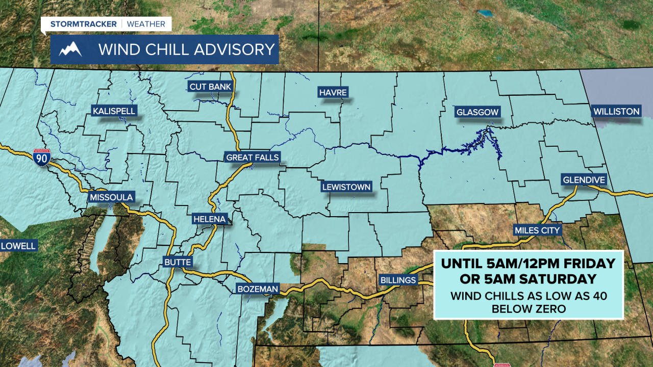 A WIND CHILL ADVISORY is in effect for all of central and north-central Montana until 5am/12pm Friday or 5am Saturday depending on your exact location. Wind chills as low as 40 below zero are possible.