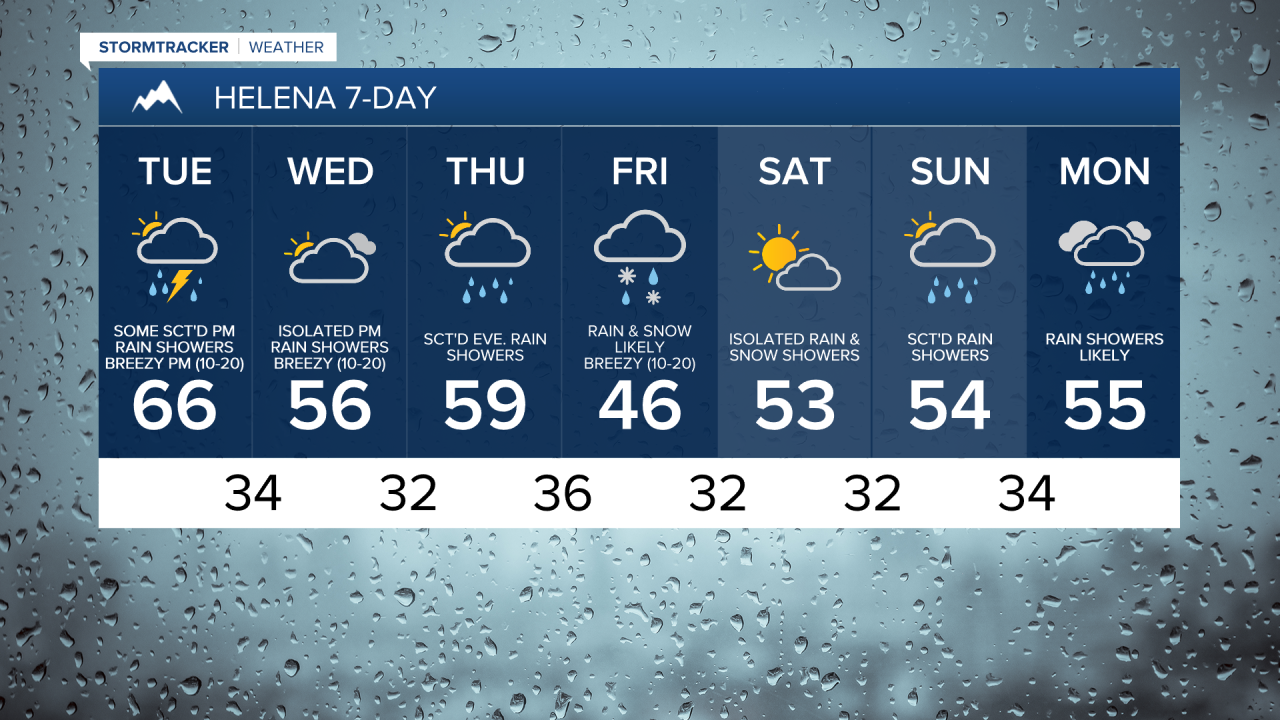 It is then going to be breezy and cooler on Wednesday as sustained wind speeds are going to be between 10 and 25 mph, and high temperatures are going to be in the 50s in most locations. We are also going to have partly to mostly cloudy skies on Wednesday, and there are going to be a few scattered rain showers and isolated thunderstorms around late Wednesday afternoon and Wednesday evening in locations south and east of Great Falls as a disturbance passes by our area to the southeast.