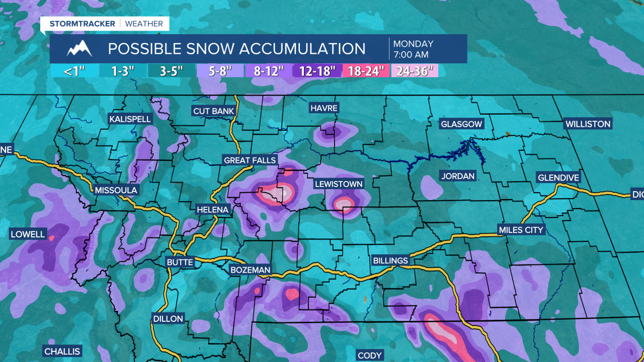 In the lower elevations, up to 6" of snow is possible this weekend, although higher amounts are expected in northerly upslope regions in central Montana, like around Lewistown and Stanford. This is where snow accumulations could approach or even exceed a foot.