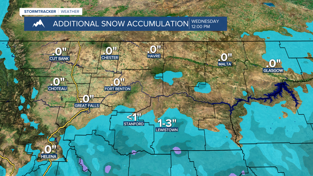 Between Monday evening and Wednesday evening, little to no snow accumulation is expected for many locations in north-central Montana. However, if you are in Broadwater County, Fergus County, Jefferson County, Judith Basin County, Lewis and Clark County, or Meagher County, up to 3 inches of new snow accumulation is expected below 5000 feet, and 2 to 6 inches of new snow accumulation is expected above 5000 feet between Monday evening and Wednesday evening.