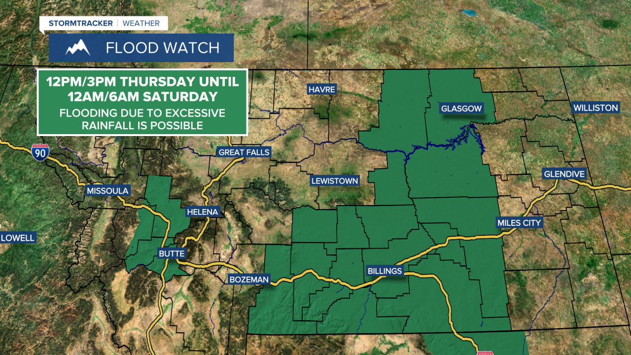 A FLOOD WATCH is in effect for portions of southern and eastern Montana from 12pm/3pm Thursday until 12am/6am Saturday. Flooding due to excessive rainfall is possible.