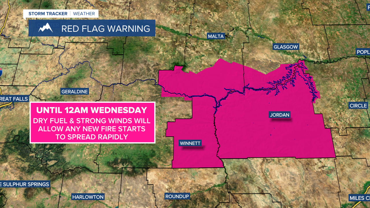 A RED FLAG WARNING is in effect for southern Phillips County and southern Valley County until 12am Wednesday. Dry fuel and strong winds will allow any new fire starts to spread rapidly.