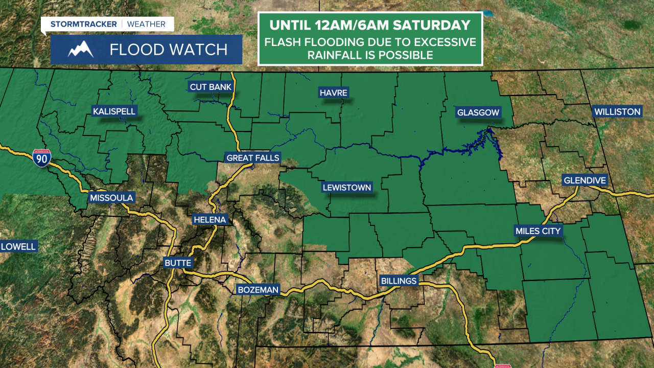 A FLOOD WATCH is in effect for a lot of Montana until 12am/6am Saturday. Flash flooding due to excessive rainfall is possible.