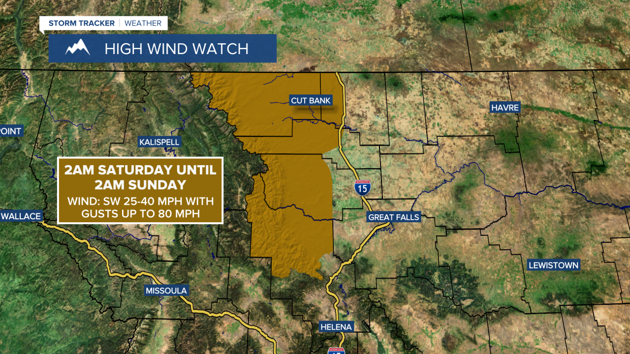 A HIGH WIND WATCH is in effect for the Rocky Mountain Front and some adjacent locations from 2am Saturday until 2am Sunday.