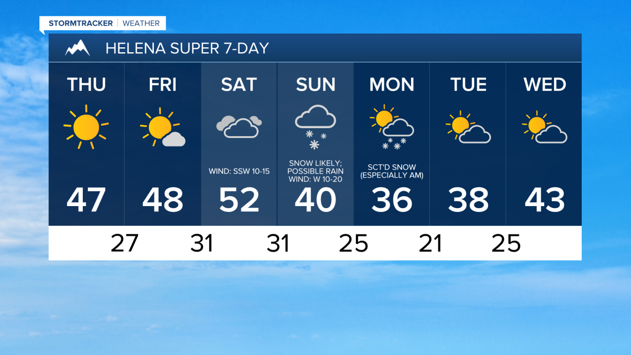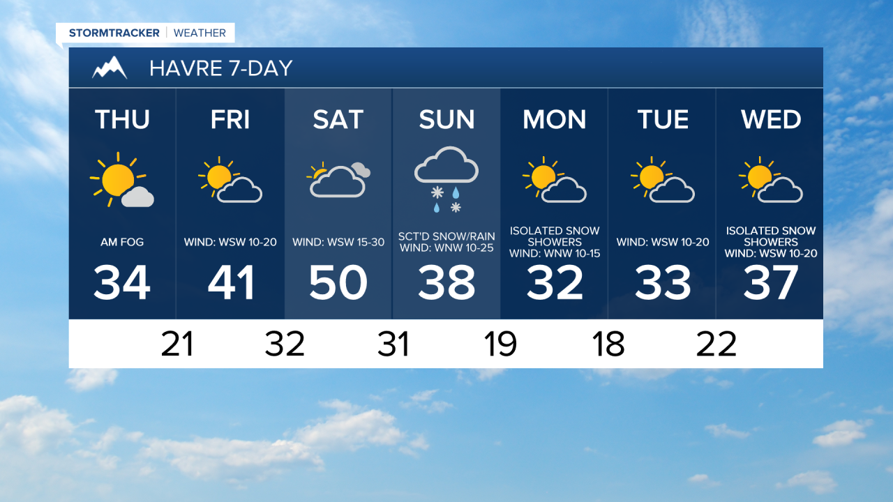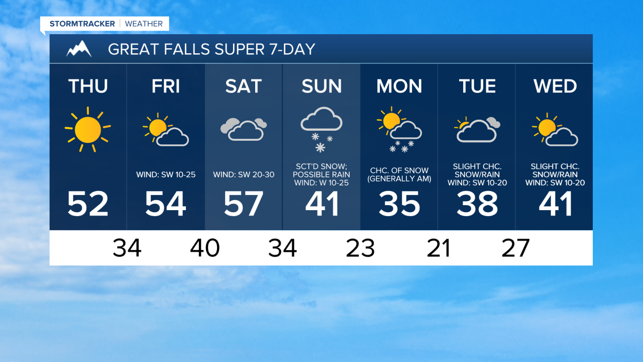Saturday is then going to be the windiest and warmest day of the next week. On Saturday, sustained wind speeds in a lot of locations are going to be between 15 and 35 mph, and wind gusts over 50 mph are possible. Per usual, even stronger wind is expected along the Rocky Mountain Front where wind gusts over 70 mph are possible. It is also going to be mild on Saturday as highs are going to be in the 50s and mid to upper 40s in most locations. We are also going to have mostly cloudy to overcast skies on Saturday with a few rain and snow showers around, mainly along the Divide, as a storm system begins to approach our area.