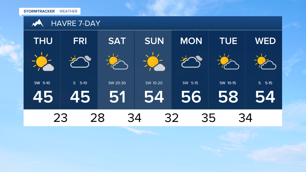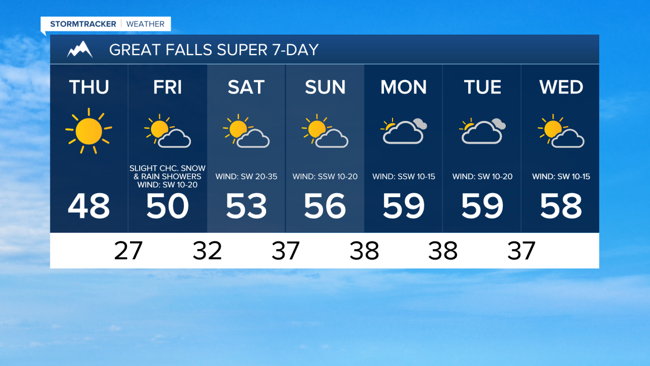 On Friday, we are going to have partly to mostly cloudy skies with some snow and rain in western Montana and in the Rockies as a disturbance passes through our area. East of the Rockies, there are only going to be some isolated snow and rain showers around, generally in the mountains. Breezy conditions are also expected on Friday along the Rocky Mountain Front and out through Cut Bank, Great Falls, and Stanford as sustained wind speeds are going to be between 10 and 25 mph. Also, highs on Friday are once again going to be in the 40s and low 50s.