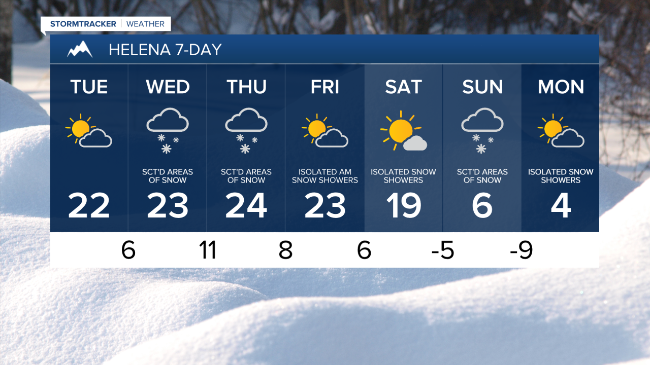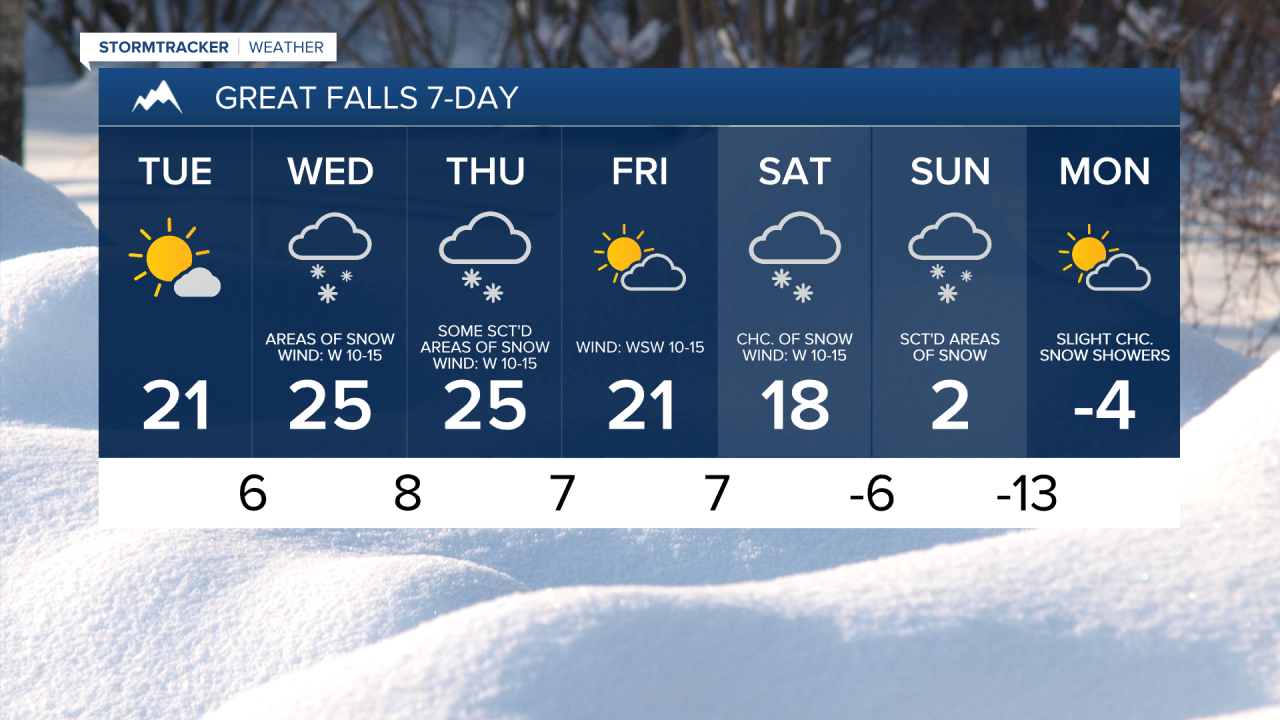 We are going to have mostly cloudy skies tonight with some isolated areas of snow around, generally before midnight and mainly in central Montana. New snow accumulation of up to an inch is possible. It is also going to be cold tonight as lows are going to be in the single digits above/below zero.