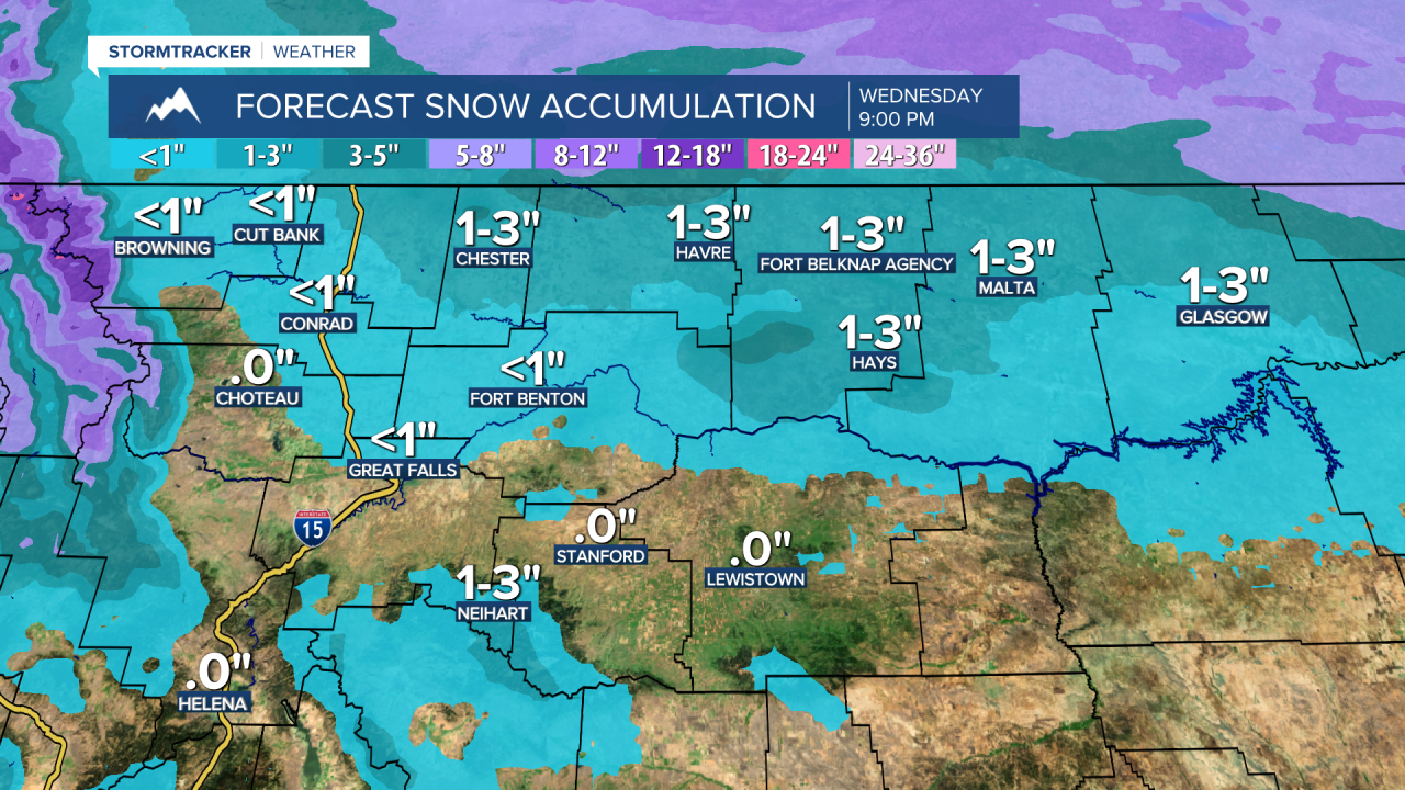 In the lower elevations, up to 2” of snow accumulation is possible from tomorrow night through Wednesday evening, with the highest snow amounts expected along the Hi-Line east of I-15. In the Rockies, up to a foot of snow accumulation is possible tomorrow evening through Wednesday evening, with up to 18” of snow possible on the highest peaks. In the other mountain ranges, less than 3” of snow is expected with this disturbance. Again, be prepared for slippery roads when traveling, especially at and above mountain pass level. Also, the graphic below shows the possible snow accumulation from tomorrow evening through Wednesday evening.