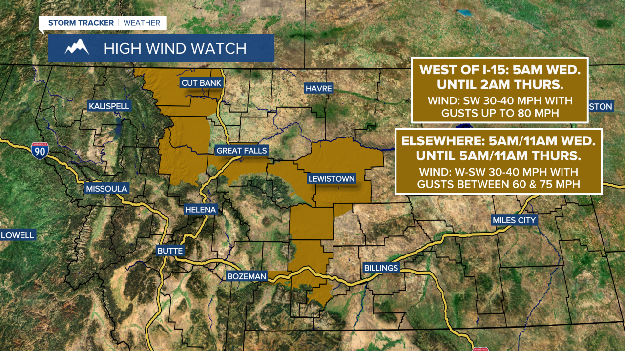 A HIGH WIND WATCH is in effect for the Rocky Mountain Front out to I-15 from 5am Wednesday until 2am Thursday, and for portions of central and south-central Montana, including Great Falls, Judith Gap, Lewistown, and Livingston, from 5am/11am Wednesday until 5am/11am Thursday.