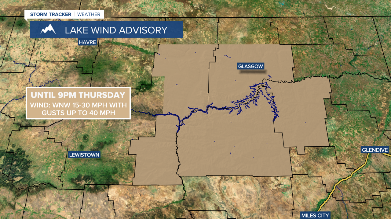 A LAKE WIND ADVISORY is in effect until 9pm Thursday for Fort Peck Lake. Sustained wind speeds are going to be between 15 and 30 mph, and wind gusts up to 40 mph are possible.