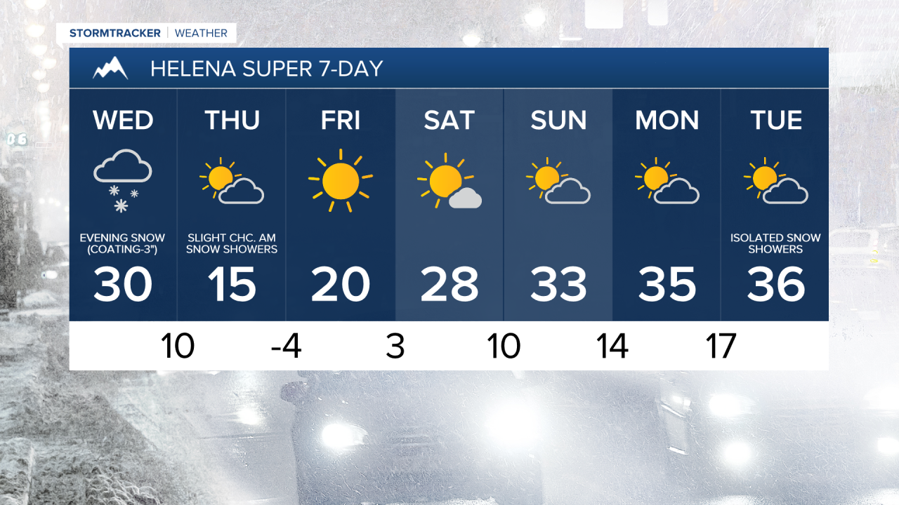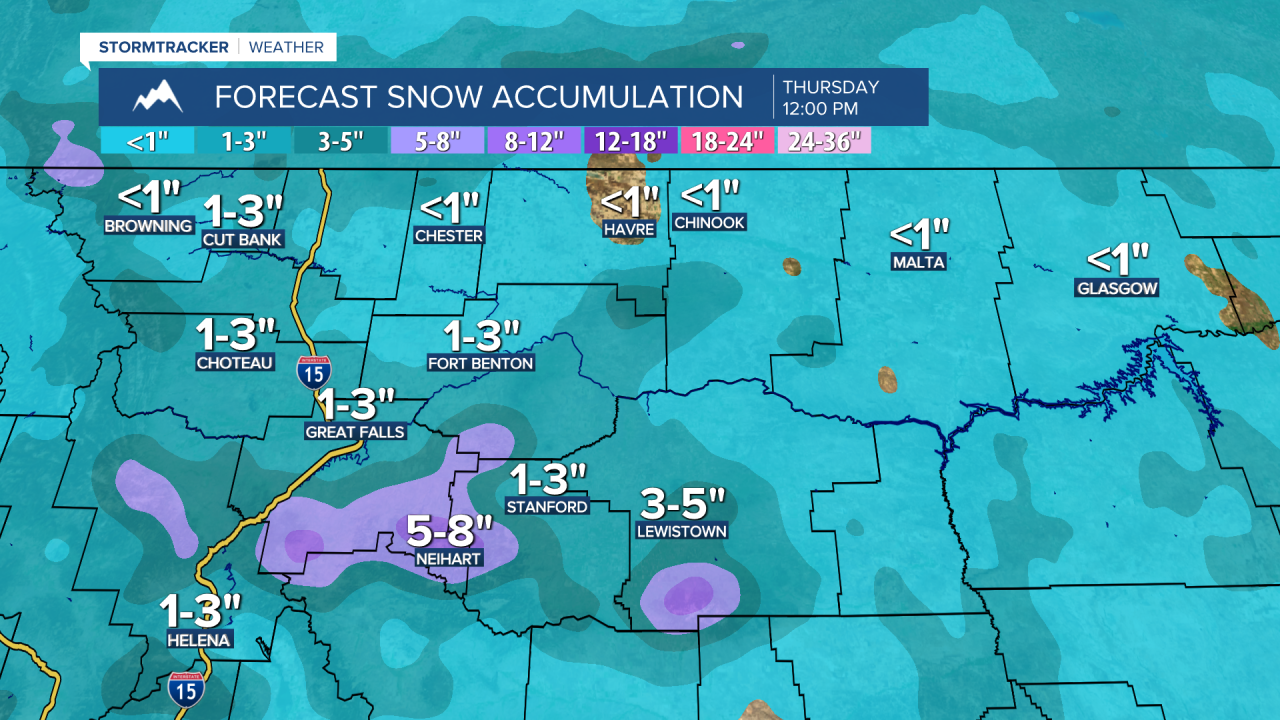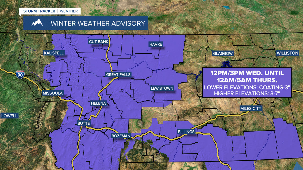 A WINTER WEATHER ADVISORY is in effect from 12pm/3pm Wednesday until 12am/5am Thursday for all of central and north-central Montana. A coating to 3 inches of snow accumulation is expected in the lower elevations, and 3 to 7 inches of snow accumulation is expected in the mountains.