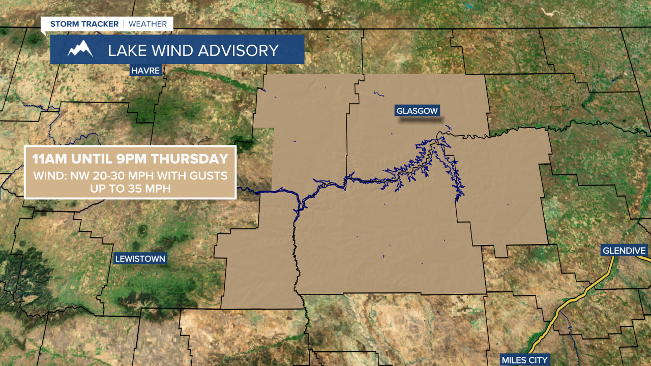 A LAKE WIND ADVISORY is in effect for Fort Peck Lake from 11am until 9pm Thursday. Sustained wind speeds are going to be between 20 and 30 mph, and wind gusts up to 35 mph are going to be possible at times.