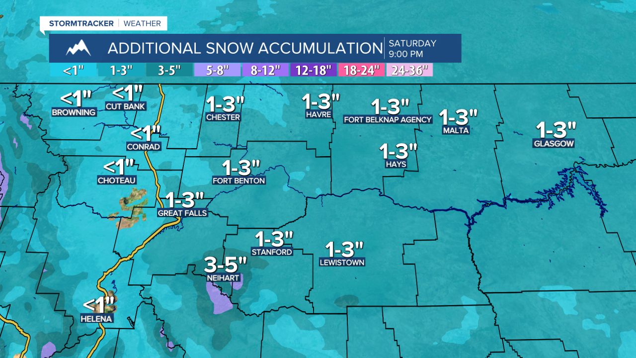 Significant snow accumulations are expected in central Montana and western portions of north-central Montana, including around Cut Bank, Great Falls, Havre, and Lewistown, from tomorrow night through Tuesday. In these areas, 4-10” of snow is expected in the lower elevations, and 6-14+” of snow is expected in the mountains and along the Rocky Mountain Front. The further north and east of Great Falls you go, the lower the snow amounts will be, with little to no snow accumulation expected from Havre to Glasgow. There is going to be a sharp cutoff in north-central Montana between nothing and several inches of snow, and any change in the storm’s path will change where this cutoff line will be, so stay tuned to KRTV/KXLH for the latest updates.