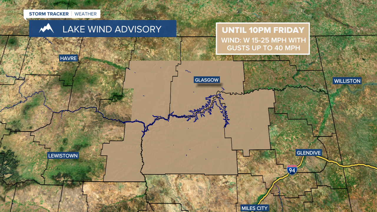 A LAKE WIND ADVISORY is in effect for Fort Peck Lake until 10pm Friday. Sustained wind speeds are going to be between 15 and 25 mph, and wind gusts up to 40 mph are going to be possible at times.
