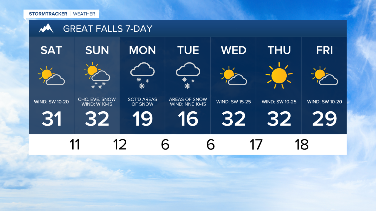 On Sunday, we are going to have increasing clouds with scattered areas of snow around during the afternoon/evening in central Montana, and a chance of snow during the evening in north-central Montana as the next storm system begins to impact our area. During Sunday afternoon/evening, a coating to 3 inches of snow accumulation is possible in locations that do see some snow. There is also going to be a bit of a breeze around on Sunday as sustained wind speeds are going to be between 5 and 20 mph. It is also going to be chilly on Sunday as highs are going to be in the 20s and low to mid 30s.
