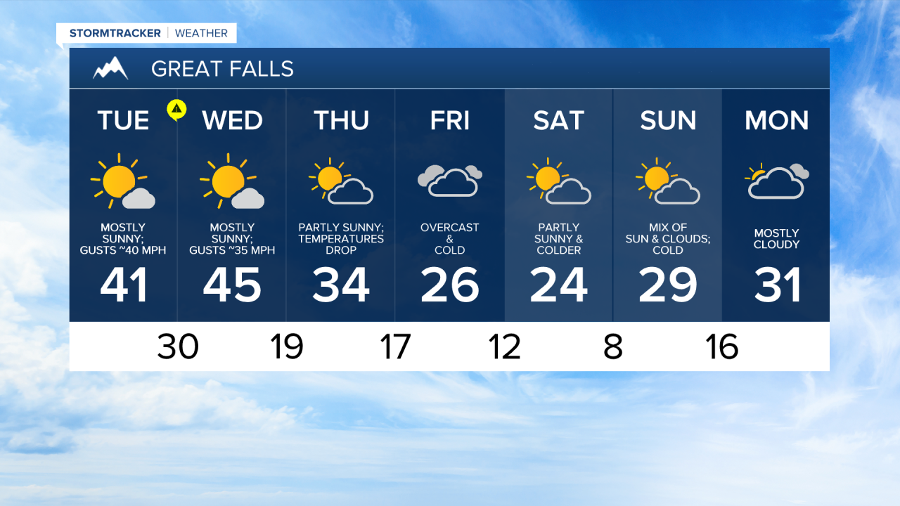 A High Wind Warning is in effect from 12 p.m. Tuesday through 9 a.m. Wednesday for those in St. Mary, Cut Bank, Teton Pass and Augusta. 80 mph wind gusts will be possible.
