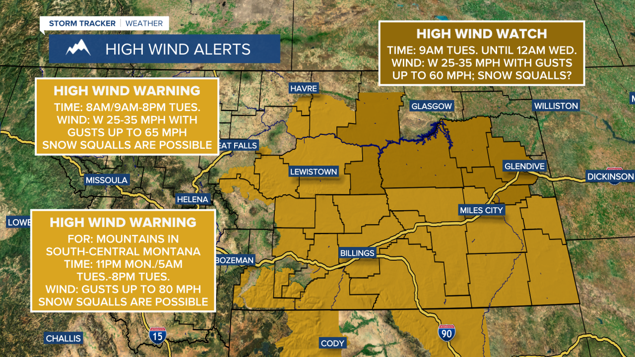 There is also a HIGH WIND WARNING in effect for portions of north-central Montana east of I-15 from 8am/9am until 9pm tomorrow and there is a HIGH WIND WATCH in effect for portions of northeastern Montana from 9am tomorrow until 12am Wednesday.
