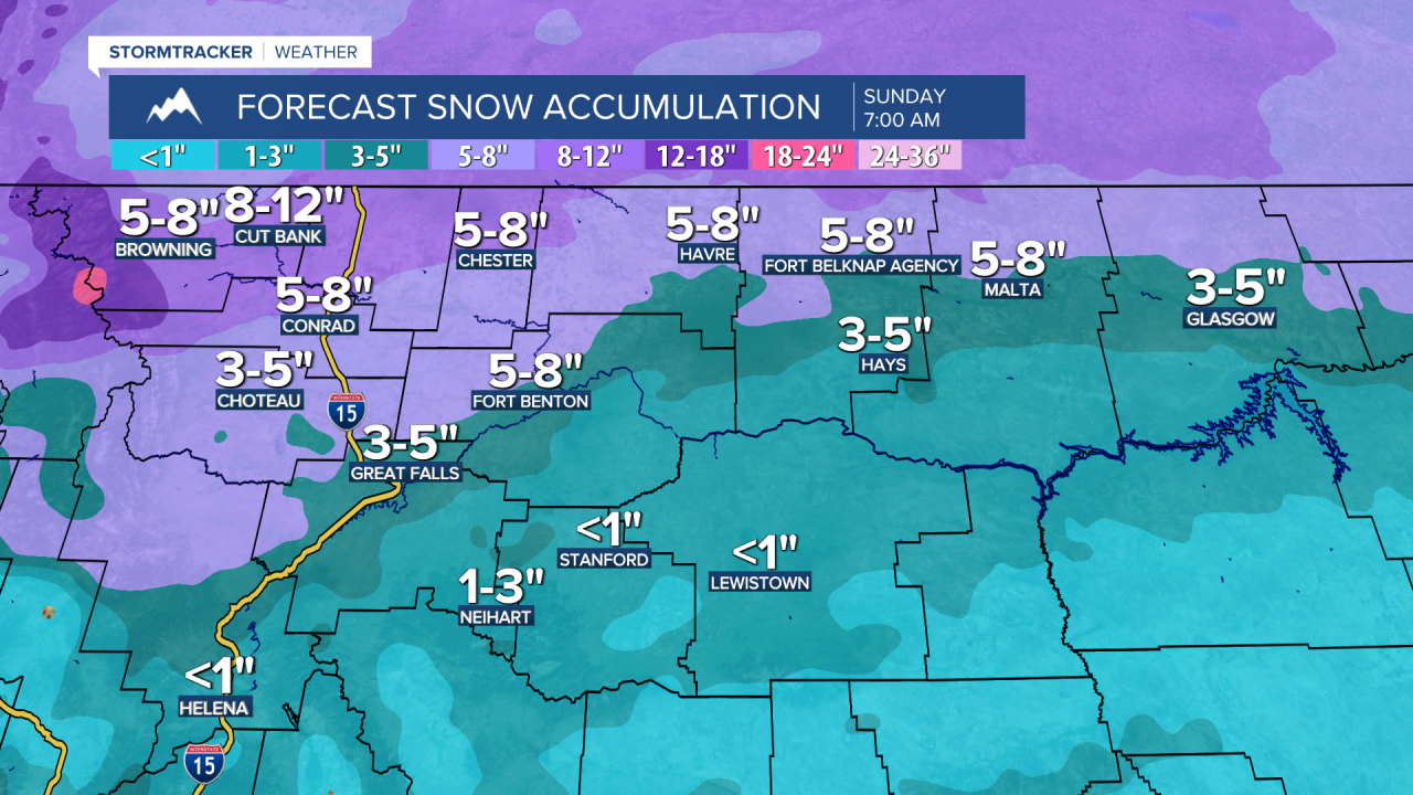 Right now, it looks like the heaviest snow amounts through Sunday morning will be along the Rocky Mountain Front and along western portions of the Hi-Line, including in Havre and Cut Bank, where 5-12” of snow is expected. In the Glacier National Park area, up to two feet of snow accumulation is possible through Sunday morning. South of the Hi-Line and east of the Rocky Mountain Front in north-central Montana, 1-6” of snow accumulation is expected through Sunday morning, with some of that accumulation occurring tomorrow and then some more accumulation expected later on Saturday. Around Helena, a coating to 3 inches of snow accumulation is expected through Sunday morning, with most of that accumulation occurring Saturday afternoon through Saturday night.