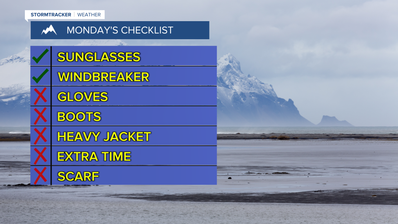 Monday: Mostly sunny skies through mid-afternoon followed by increasing cloud cover during the evening. Breezy conditions will persist with sustained winds of 15-25mph and gusting to 45mph. Higher gusts likely east of the Rockies. High temperatures will be in the low to mid 50s. Overnight lows in the low to mid 20s.