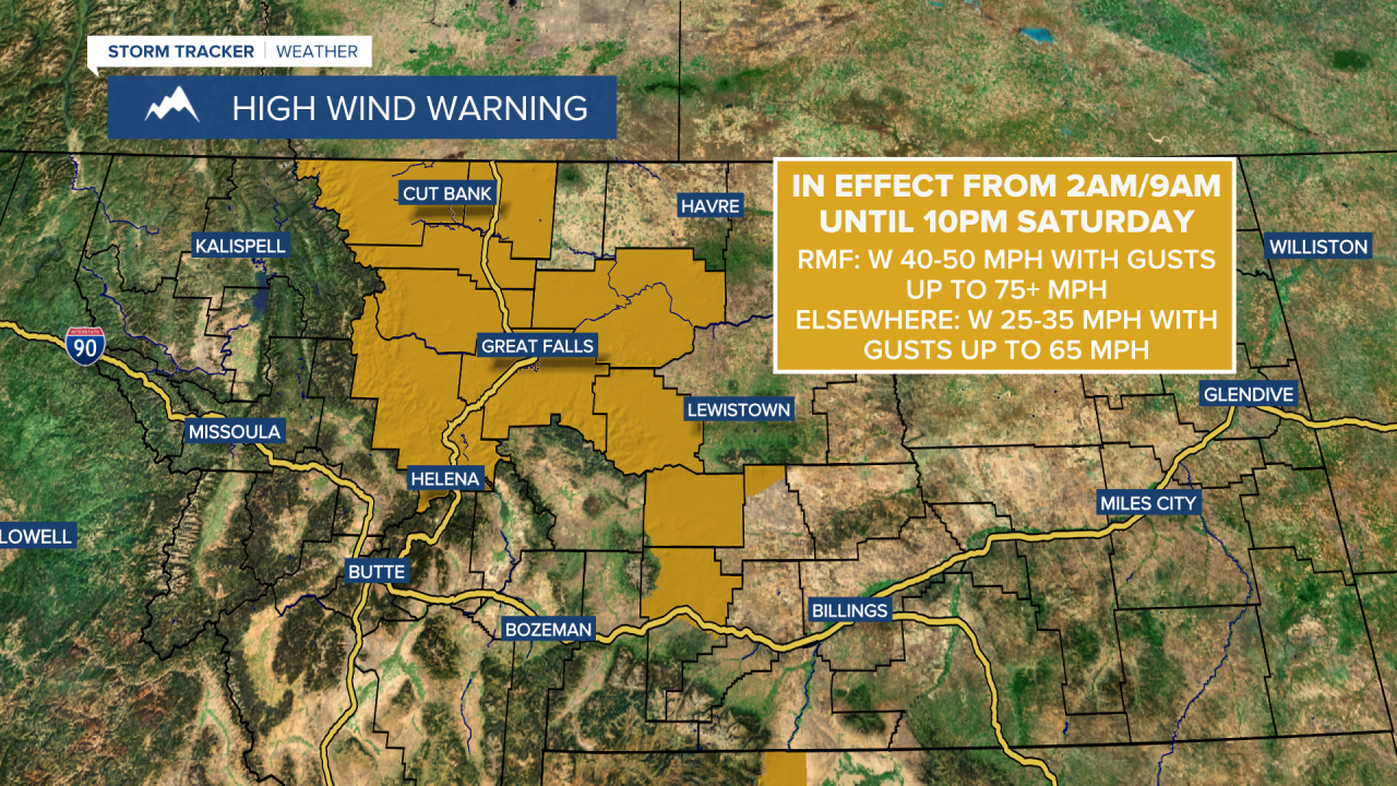 A High Wind Warning is in effect for some locations east of the Rocky Mountain Front from 9am until 10pm Saturday. Sustained wind speeds are going to be between 25 and 35 mph, and wind gusts up to 65 mph are going to be possible at times.