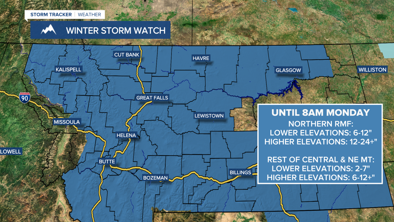 A Winter Storm Watch is in effect for the rest of central and northeastern Montana from sometime Saturday night through 8am Monday. 2 to 7" of snow accumulation is possible in the lower elevations, and 6 to 12+" of snow accumulation is possible in the mountains and over mountain passes.